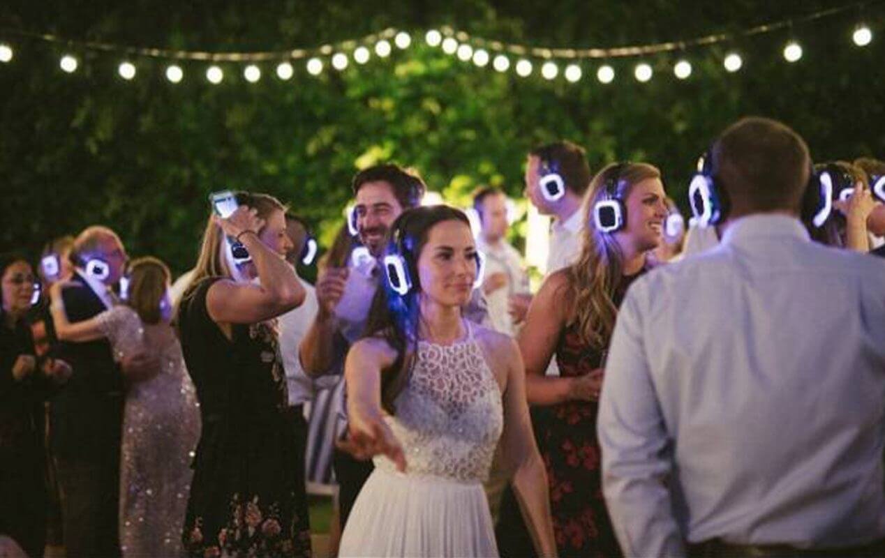 Now there’s an easy solution: Sound Off™ silent disco technology not only amps up the party, but allows it to go on as long as the newlyweds want — anywhere, indoors or out. At a silent disco wedding celebration, the crisp, high-fidelity audio stays in the guests ears only, and no one else is the wiser.